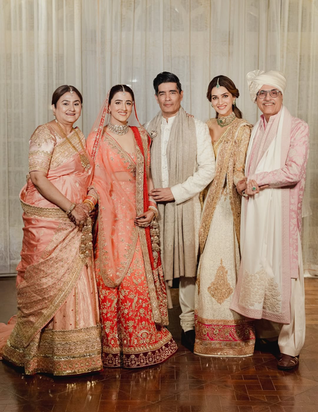 Sharing some photos of her and her family members posing with the designer, Kriti expressed, “Special post for a special friend @manishmalhotra05 !!! Thank you for dressing up my whole family so beautifully for the hindu wedding! (sic)”